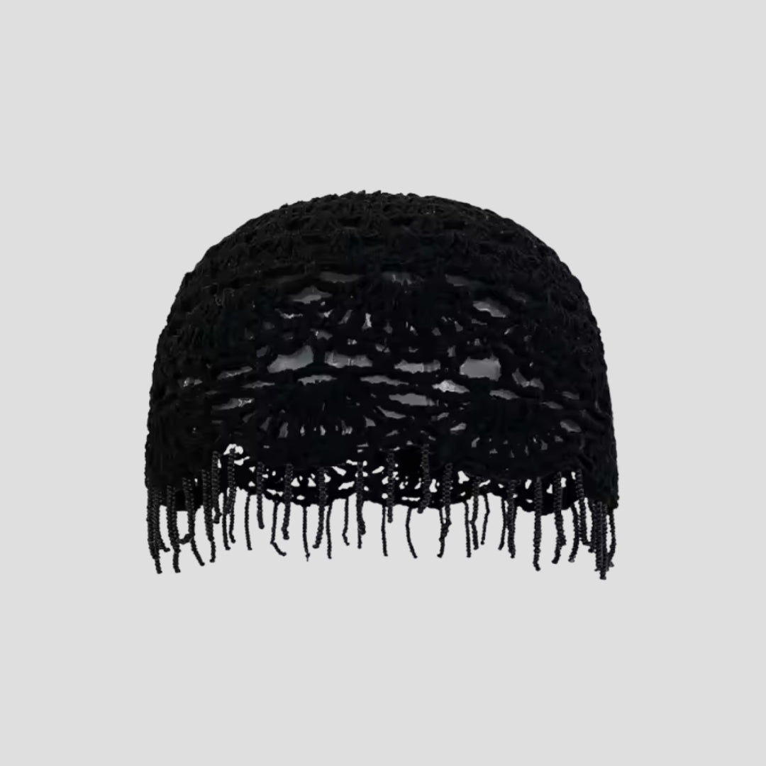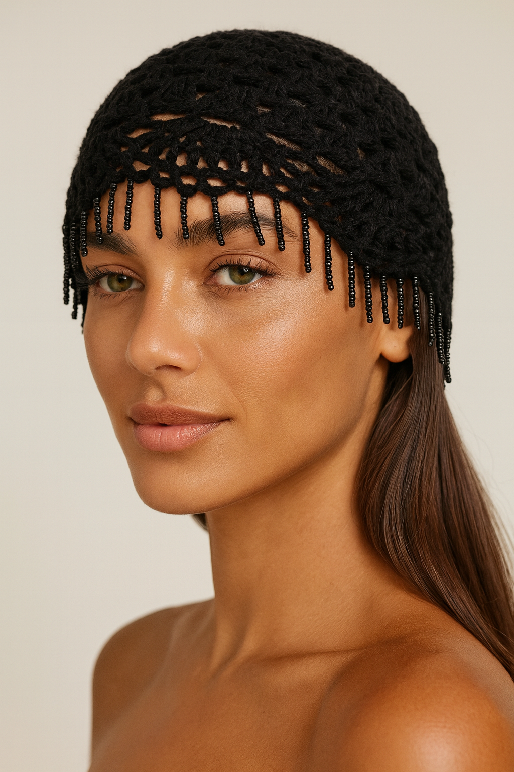 Un bonnet travaillé au crochet, rehaussé de fines franges ornées de petites perles noires. Léger mais plein de caractère, il apporte une touche originale et élégante à vos tenues, aussi bien au quotidien qu’en soirée